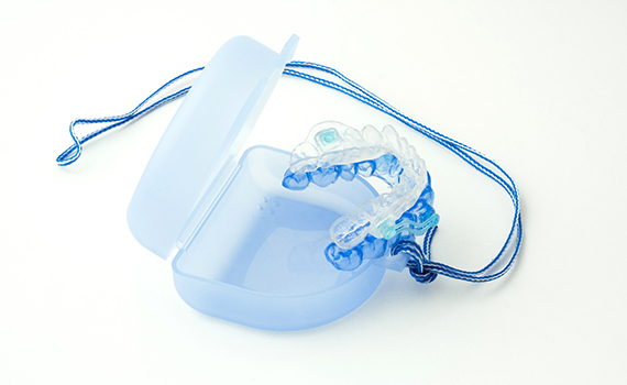 Similar in appearance to a sport mouth guard fitted over both the top and bottom teeth it pushes the bottom jaw forward. For most people this opens up the airway and supports it so it is less likely to collapse, helping to reduce the number and severity of sleep apnoea events.
